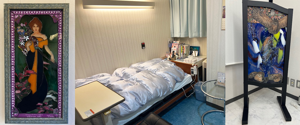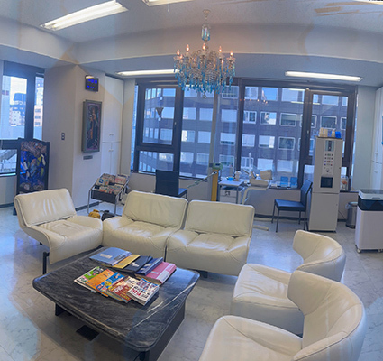 心地よいゆとりを感じていただける待合室には、トーマス・キンケードの絵画、ベネチアングラスのシャンデリア、ハンドメイドのステンドグラスを配し、静けさと上質さが調和する空間として設計しております